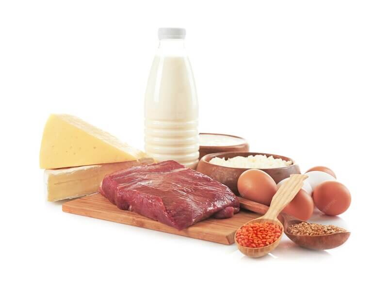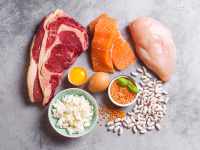 Kilder til protein er blant annet kjøtt, fisk, belgfrukter og meieriprodukter.